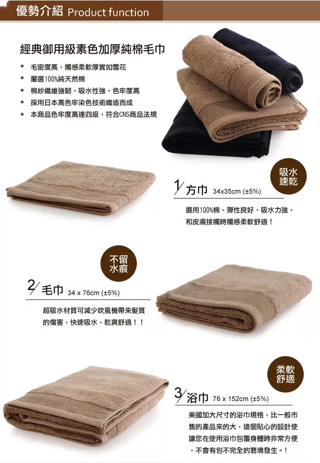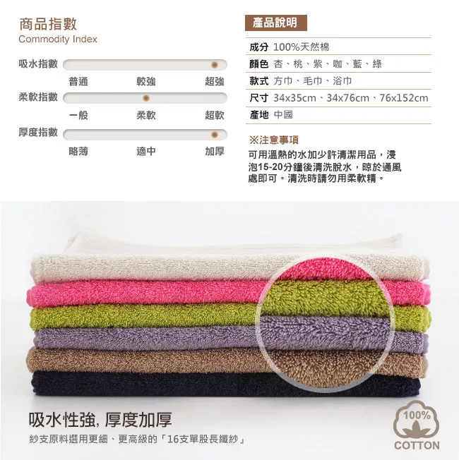 紗支原料選用更細、更高級的「16支單股長纖紗」,依照美國毛巾組織及規格製做,高牢度的耐用、更厚實的手感、更蓬鬆吸水及柔軟的優點;美國加大尺寸的浴巾規格,比一般市售的產品來的大,這個貼心的設計使讓您在使用浴巾包覆身體時非常方便,不會有包不完全的窘境發生。 商品規格 品牌:Lovel 愛生活 成分:100%天然棉 尺寸:76 x 152cm (±5%) 產地:中國 ? 商品訊息簡述: Lovel 經典御用級素色加厚純棉浴巾(共6色)桔梗紫 |